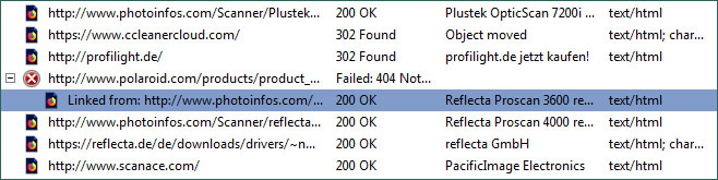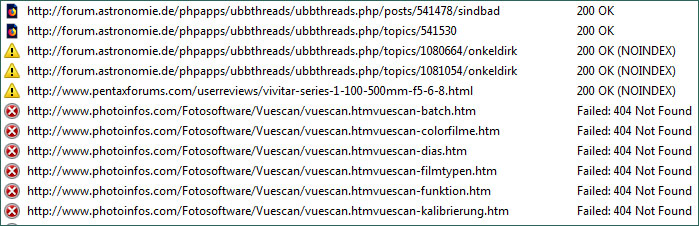 Hier werden Fehler bei Seiten über Vuescan angezeigt, die bei Prüfung der Links im Browser und mit dem Webprogramm Dreamweaver nicht nachvollzogen werden können.