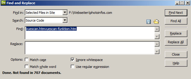 Bei der Suche nach einem der angezeigten Fehler im Code der gesamten Website findet Dreamweaver keine entsprechenden Code-Schnipsel. In diesem Fall düfte ein Jump-Register das SEO Tool ASEOPS in die Irre geführt haben.
