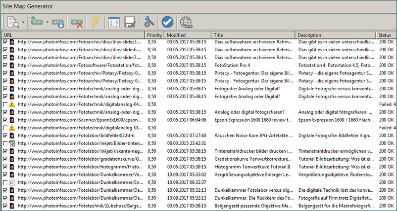 Der Site Map Generator eines SEO Pogramms (hier ASEOPS 10) listet alle verlinkten Seiten und Elemente auf. Die Liste zeigt Fehler an, wenn auf Dinge verwiesen wird, die gar nicht mehr vorhanden sind. Dies bietet eine gute Möglichkeit, diese Fehler zu erkennen und zu korrigieren.