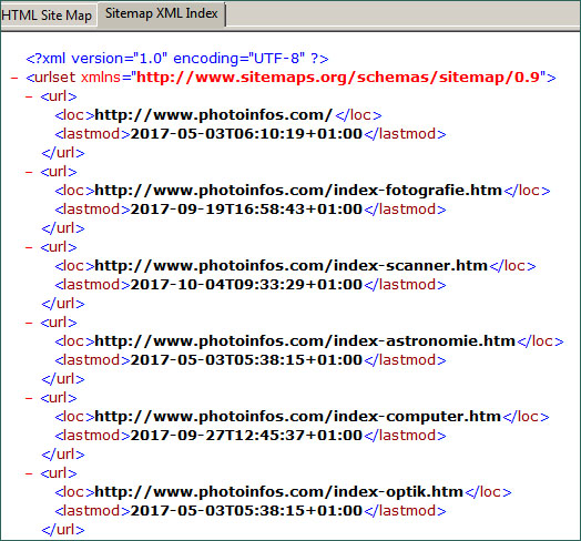 Site Map im HTML Format. Diese Liste kann als Webseite angezeigt werden. Das macht nur Sinn, wenn die Liste überschaubar ist. Eventuell kann man die Liste manuell kürzen, um daraus einen sinnvollen Index zu erstellen.
