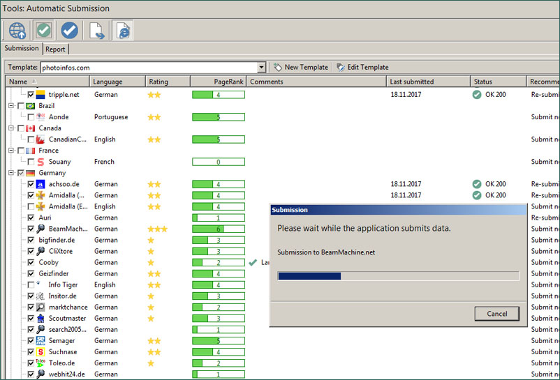 Für einen Test dieser Funktion wählten wir im Programm ASEOPS 10 alle aufgeführten deutschsprachigen Suchmaschinen und starteten den Eintragsvorgang. Nach einigen Minuten zeigte ASEOPS an, dass der Eintrag bei den meisten geklappt hatte, nur bei vier Suchmaschinen gab es eine Fehlermeldung. Bei einer näheren Untersuchung stellte sich heraus, dass diese Suchmaschinen gar nicht mehr aktuell waren.