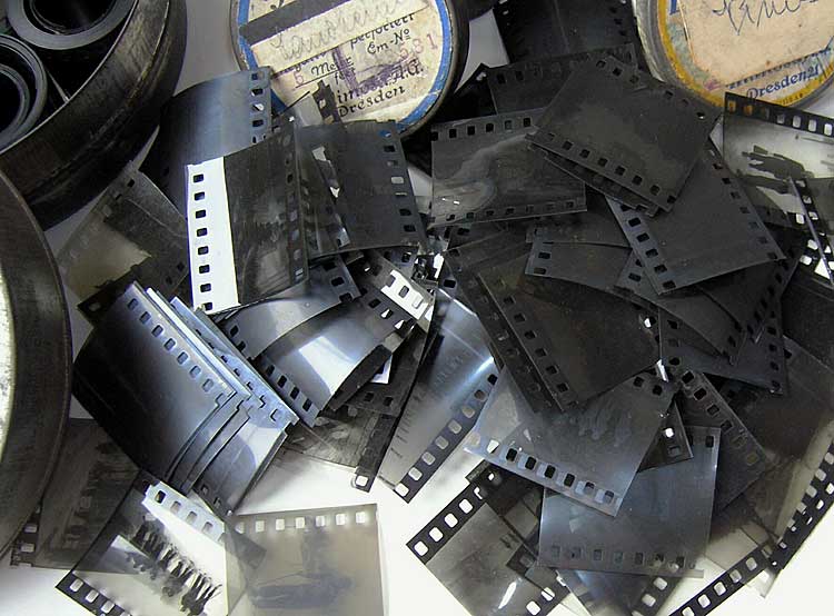 Um sie zu lösen, wurden die Rahmen geöffnet und die Glasscheibe, an der ein Dia klebte, aus dem Plastikrahmen gedrückt. Sie wurde in ein handwarmes Wasserbad mit einem kleinen Spritzer Netzmittel gelegt bis sich die Dias schadlos ablösen lassen. Anschließend wurden sie getrocknet und darauf geachtet, dass die ursprünglichen Beschriftungen der alten Rahmen jedem Bild korrekt zuzuordnen blieb.Das ist keine Beschäftigung für ungeduldige Gemüter. Die meisten Dias wurden zwischen zwei Gläser gerahmt, die mit Papierstreifen um die Ränder zusammengeklebt wurden. Ihr Erhaltungszustand ist unabhängig von ihrem Alter sehr unterschiedlich. Am besten öffnet man sie mit einem scharfen Teppichmesser, dessen Klinge weit aus dem Griff ausgefahren wird. Die Verletzungsgefahr ist bei den vielen scharfkantigen Gläsern nicht unbeträchtlich. Man kann sich leicht schneiden. Diese Arbeiten sind geisttötend und können bei einem so großen Nachlaß jahrelang dauern.