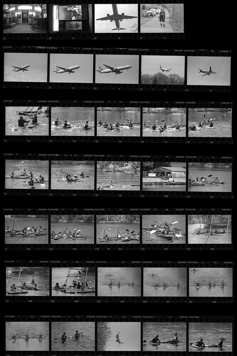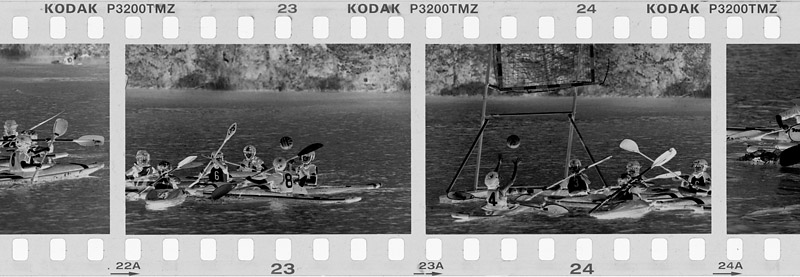 Kodak Alaris schickte mir im April 2018 vier Filme zum Testen. In der Nähe meines Bootsliegeplatzes war ein Wassersportverein beheimatet, in dem Wasserpolo gespielt wurde. Im Hohenzollernkanal (Berlin) waren dafür Tore verankert und die Spieler flitzten mit ihren kleinen Kanus hin und her, um den Ball in das gegnerische Tor zu bringen. Auf dem Wasser ging es ruppig zu. Die Boote stießen oft zusammen oder gerieten über- oder untereinander. Die sportliche Action mit schnellen Bewegungen konnte gut zum Testen des T-MAX P3200 herhalten.Dafür hatte ich meine alte Pentax Z1 Spiegelreflex aus den frühen 1990er herausgekramt und ein Sigma Apo 4/300mm Teleobjektiv daran montiert. Nicht nur die Leistungsfähigkeit des Films interessierte mich, sondern auch, ob die alte Kamera der Aufgabe gewachsen war. Kein Problem, wie sich herausstellte. Der Autofokus war nicht langsamer als bei einer modernen DSLR und sogar recht treffsicher.