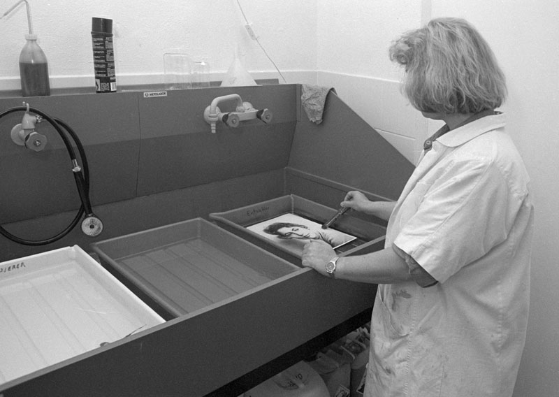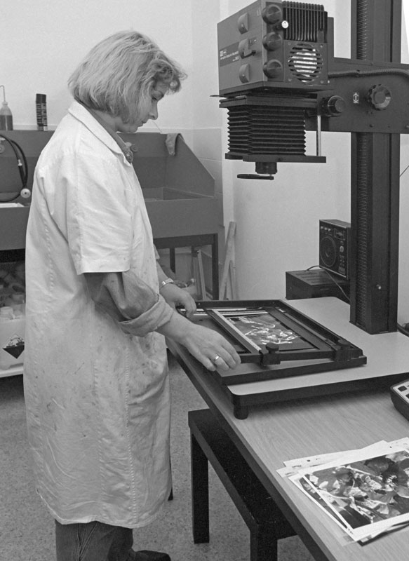 Fotolaborantin am Jobo 7451 Vergrößerungsgerät (Diffusion Modular Enlarger). Er reicht für Filmformate vom winzigen Minox (8 × 11mm) bis zum 4x5 Inch Planfilm.