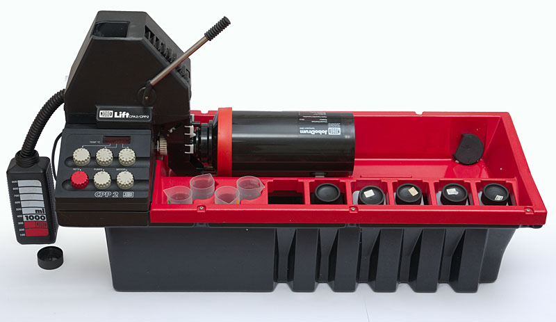Die JOBO Colorprocessoren CPE-2, CPA-2 und CPP-2 sind halbautomatische Entwicklungsmaschinen. Bei der CPE-2 und CPA-2 beträgt der einstellbare Temperaturbereich 20°-45°C mit einer maximalen Toleranz von 0,2° C. Bei der CPP-2 kann der gleiche Temperaturbereich eingestellt werden, jedoch in 0,1° Schritten. In der CPA-2 und CPP-2 sorgen Umwälzpumpen für eine Zirkulation des Wassermantelbades. Die JOBO Colorprocessoren drehen die Entwicklerdosen und ändern regelmäßig die Rotations-Richtung.Die JOBO CPE-2 kann Papierformate bis 30 x 40 entwickeln, während die CPA-2 und CPP-2 / CPP-3 bis 40 x 50 cm ermöglichen und mit dem JOBO-Lift sogar bis 50 x 60 cm. Die JOBO CPA-2 und CPP-2 haben Umwälzpumpen für das Wasserbad und stufenlos regelbare Drehgeschwindigkeit von ca. 20-80 U/min.