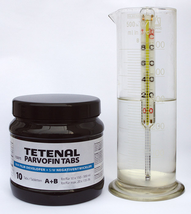 | Aus dem Datenblatt von Tetenal: "Der Ansatz erfolgt durch das Auflösen von PARVOFIN TABS in heißem Wasser. Ideal ist ca. 50-60 °C heißes Wasser – höhere Temperaturen sind möglich, hingegen verhindern niedrigere Temperaturen das schnelle Auflösen der Tabletten. Die Portionierung „je 1 Tablette A und B für 150 ml“ als Normalverdünnung ermöglicht ein besonders einfaches und gleichzeitig auch ein sehr variables Handling: Je nach Füllmenge der verwendeten Entwicklungsdose wird die erforderliche Anzahl Tabletten in Wasser aufgelöst, z.B. 2 x A und 2 x B für 300 ml oder 3 x A und 3 x B für 450 ml, usw. Optional kann mit einer Sparverdünnung gearbeitet werden. Dann ist die Portionierung „je 1 Tablette A und B für 300 ml“. Gleichermaßen kann auch hier in Schritten von jeweils 300 ml ein Mehrfaches von 300 ml angesetzt werden: z.B. je 2 x A und 2 x B für 600 ml, 3 x A und 3 x B für 900 ml, usw. Ob die Normalverdünnung oder die Sparverdünnung angewendet wird, ist eine individuelle Entscheidung des Anwenders – beide Optionen ermöglichen eine gleich hohe Qualität der Entwicklung. Die Sparverdünnung erfordert längere Entwicklungszeiten, sie steht aber auch für niedrigere Kosten. ... " |