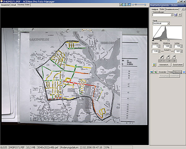 Man beachte die Einstellungen am Histogramm. Der rechte Regler (kleines weisses Dreieick) wurde an das rechte Ende der Tonwertdarstellung geschoben. Das Bild wird heller.