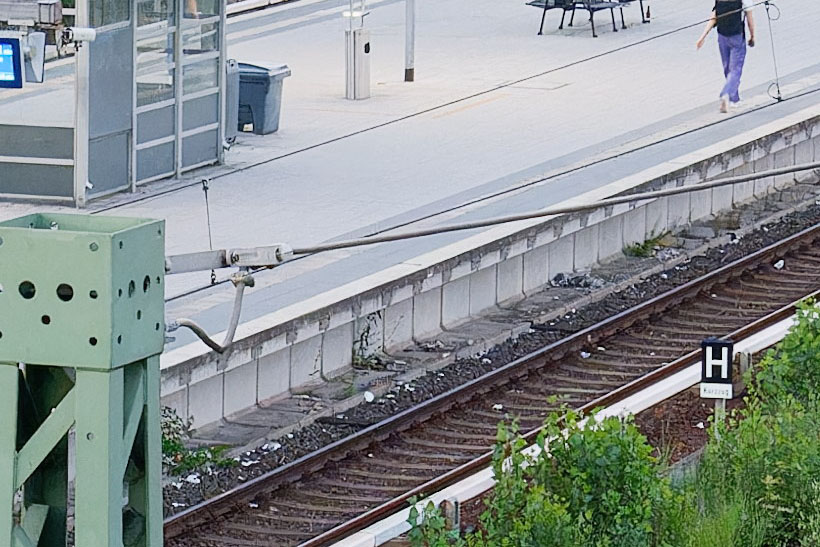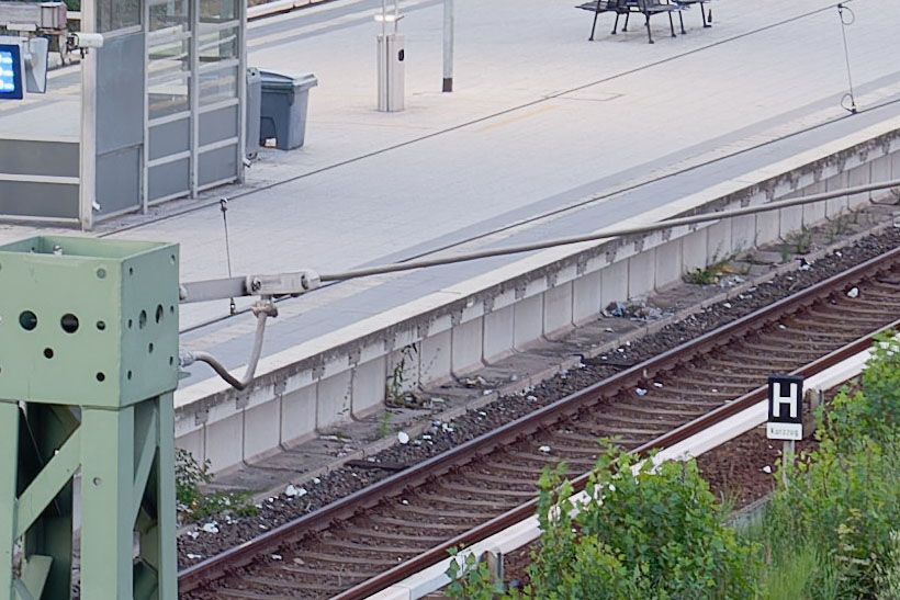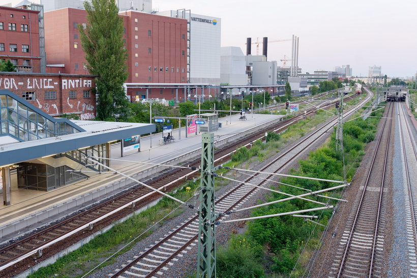 Testmotiv: Berlin. Blick von der Putlitzbrücke auf die S-Bahnstation Westhafen und Gleise nach Sonnenuntergang. Dieses Motiv wurde mit ISO Werten von 50 bis 102400 fotografiert, um die Qualitätsveränderung durch ansteigende ISO-Werte zu verfolgen.