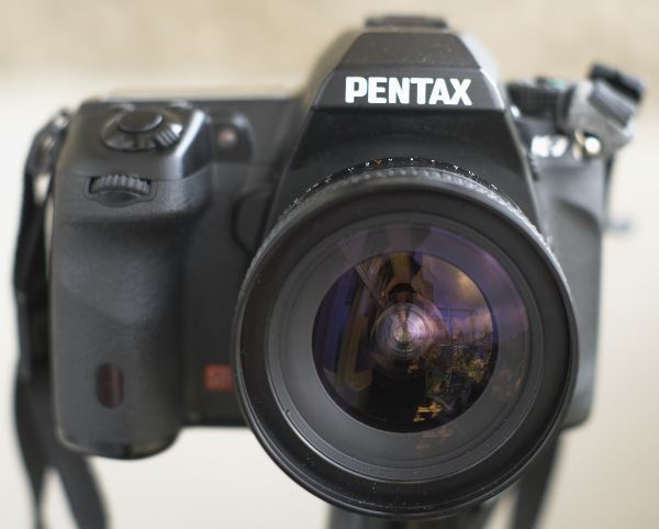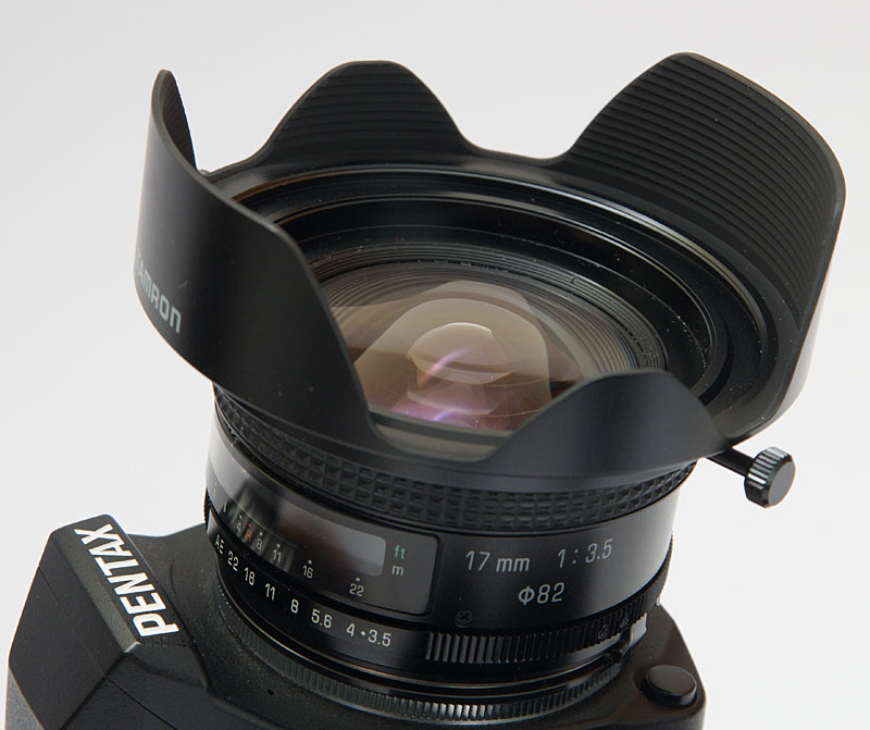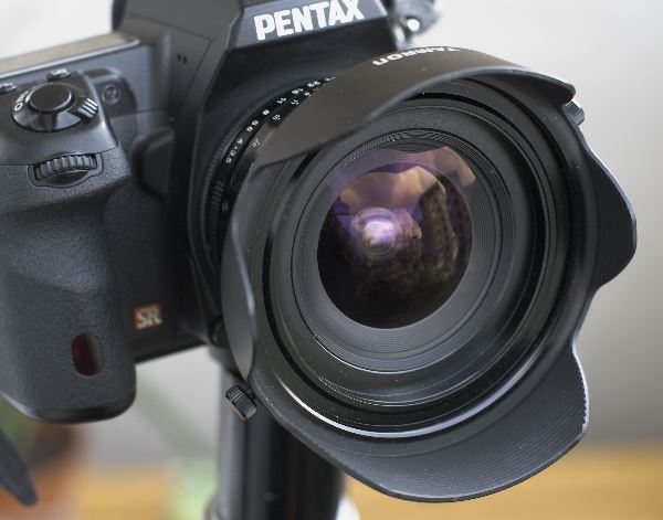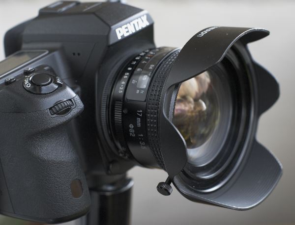 Das Tamron SP 17mm mit Sonnenblende an einem Pentax K-7 Gehäuse.