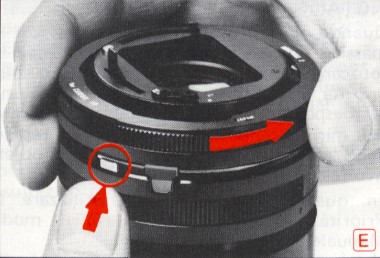 E. Zum Entfernen des Adaptall-Adapters vom Objektiv, wird die größte Blende eingestellt. Danach wird die verchromte Verriegelung eingedrückt und der Adapter gegen den Uhrzeigersinn abgedreht.