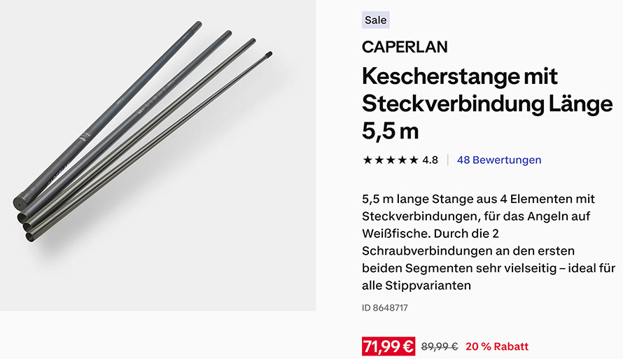 Neben den gängigen 3-Meter-Modellen sind auch längere Varianten erhältlich. Kescherstäbe mit 3 Metern Länge kosten etwa 20 bis 40 €, während Modelle mit 4 bis 5 Metern meist unter 100 € liegen. Wichtig ist, auf eine ausreichende Steifigkeit zu achten. Auf zu flexiblen Stäben wackelt die Kamera zu sehr. Hier kommt es auf das Gewicht der Kamera an, eine leichte Actioncam ist anspruchsloser als eine Systemkamera mit Wechseloptik.
