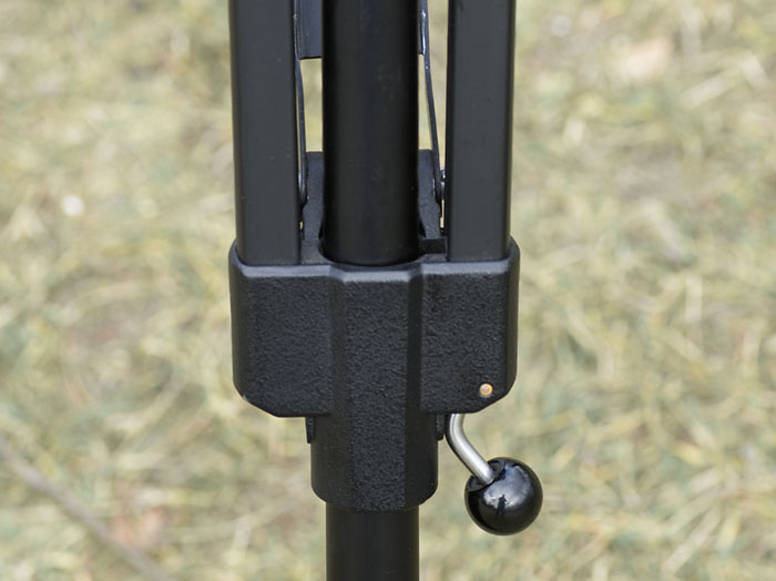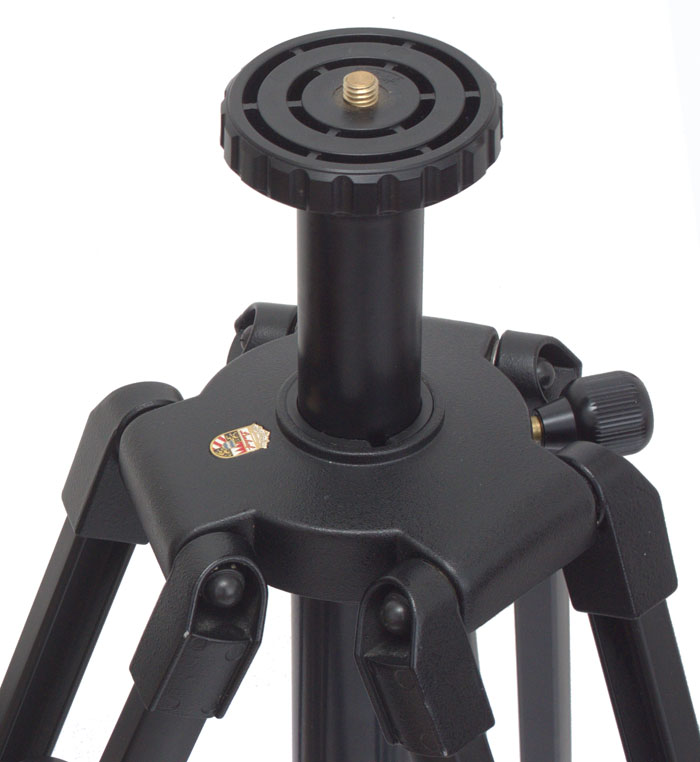 Stativschulter mit breiten Gelenken für die Stativbeine. Die Mittelsäule kann 50 cm herausgezogen werden. Sie kann durch einen Kurbeleinsatz (kleiner Kurbeleinsatz) ausgetauscht werden, die aktuell jedoch nicht im Linhof Programm zu finden ist.