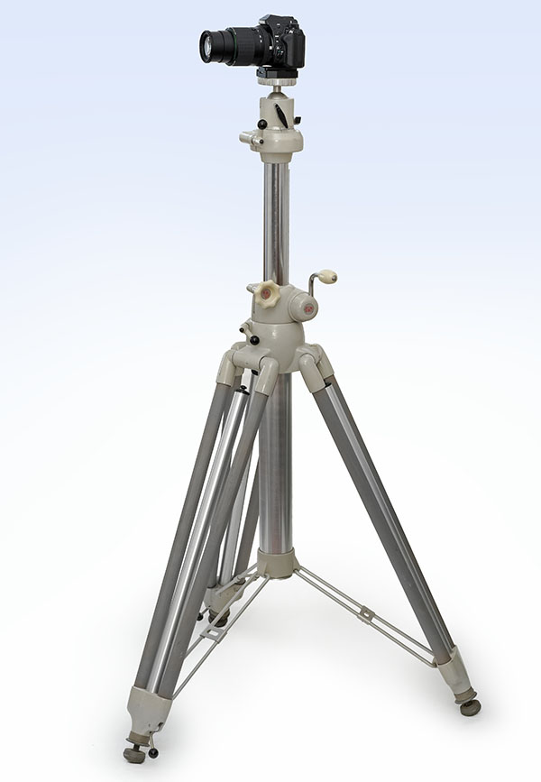 Diese Stativ von Linhof ist so gut, dass es seit etlichen Jahrzehnten hergestellt wird. Im Deutscher Photokalatog 1962/1963 ist es als Linhof Professionalstativ 420 R mit Doppelrohrschenkeln und auswechselbaren Verstrebungen, 93 / 155 cm, für 446,- DM aufgeführt. In Linhofs Preisliste aus 2020 heißt es Professional-Rohr, 91 / 155 cm für 1557 €. Der 'Große Kurbeleinsatz' (Verlängerung auf 2,20 m) kostete 1962 169,- DM und 721,- € im Jahre 2020. Damals wie heute gab es eine zweite Version, bei der pro Bein (Schenkel im Linhof Jargon) statt zweier Aluminiumrohre runde Stäbe aus Eschenholz verbaut wurden.Ohne verstellbare Mittelsäule und Stativkopf. Die Stativbeine sind in kürzester Stellung. Man kann sie durch das Herausziehen der mittleren Rohre verlängern. Wie dargestellt, erreicht das Stativ eine Höhe von 83 cm und ist eine sehr solide Basis für schwere Lasten oder um leichtere Kameras selbst bei stärkerem Wind (kein Sturm!) gut zu halten.