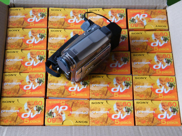 Für Mini-DV-Camcorder wird noch manche Lanze gebrochen, doch würde ich jedem Einsteiger raten, die Finger davon zu lassen. Das nachstehende Bild zeigt einen kleinen Mini-DV Camcorder von JVC. Er liegt auf einem Karton mit 100 Kassetten à 60 Minuten. Sie kosten ca. 250 €, benötigen viel Platz und müssen zeitaufwendig in den PC überspielt werden. Zudem kostet das Spulen viel Strom. Daher sind große und mehrere Akkus für eine Mini-DV notwendig. Die Filmspul- und Aufnahmemechanik ist sehr empfindlich.