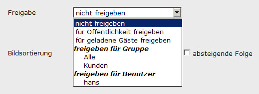 Schließlich loggt man sich in seine Pixtacy-Präsentation ein, ruft 'Bilder' auf, klickt auf 'Bearbeiten' und weiterhin auf 'Hochgeladene Bilder importieren'. Nun ist die Freigabe für den betreffenden Kreis zu definieren.