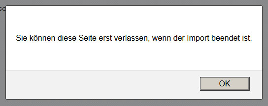 Sind wir bis hierher gekommen, geht meistens alles weitere gut, aber es kann auch schieflaufen. Dann stoppt der Vorgang und beim Versuch abzubrechen, kommt die Meldung: "Sie können diese Seite erst verlassen, wenn der Import beendet ist."