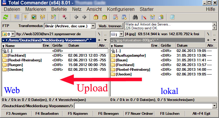 Die Verwaltung der vorbereiteten Dateien und der Upload findet mit einem effizienten Dateimanager statt. Wir nehmen den 'Total Commander'. Die Schritte sind bestens organisierbar und sehr schön ist das Erkennen durch Total Commander, welche Dateien bereits im Web sind und welche nicht. Entsprechend kann man vorgeben, dass nur die neuen Dateien hochgeladen werden, wenn das die Zielstellung ist. Lokal sollte dazu die gleiche Ordnerstruktur vorhanden sein, wie sie in den Higres- und Lowres-Ordnern im Pixtacy-Archiv online angelegt wurde.