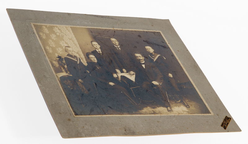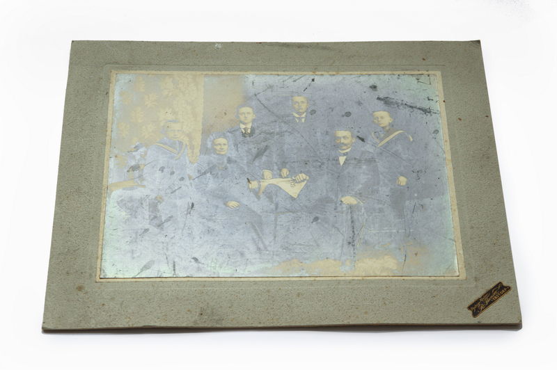 Familienfoto, aufgenommen um 1912, mit Aussilberung. Sie überlagert bei diesem Betrachtungswinkel das eigentliche Foto. Erkennbar sind auch dunkle Stellen und Kratzer auf dem Bild.
