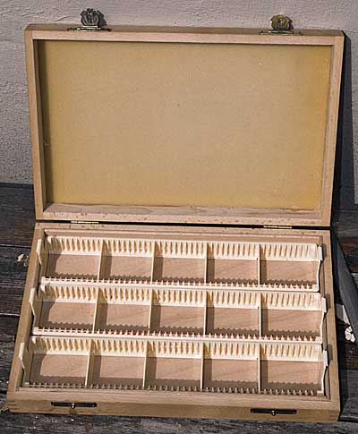 Im Westteil Deutschlands wurden die hölzernen Diakästen von Hama und Rowi komplett aus massiven oder verleimten Buchenholz angeboten.