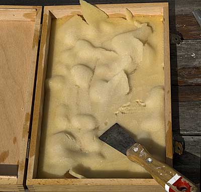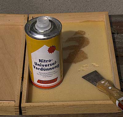 Eigentlich dürfen solche Lösungsmittel nicht mit Behältern in Berührung kommen, in denen dauerhaft Fotografien aufbewahrt werden. Doch in nebenstehenden Fall ist die Anwendung zu wagen. Der Leim unter dem Schaumstoff versiegelt die Unterseite des Holzdeckels. Der Schaumstoff läßt sich nicht herauskratzen. Ein Schuss Nitroverdünnung, welche sogleich mit einem Spatel zügig hin und her geschoben wird, löst den Schaumstoff sofort vom Untergrund. Der größte Teil der Verdünnung wird dabei vom Schaumstoff aufgesogen.