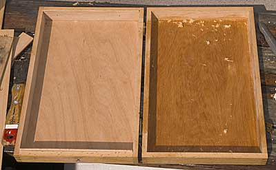 Nach seiner Beseitigung, erscheint das Holz wie lackiert. Es riecht nach Chemie, was konservatorisch nichts Gutes verheißt. Daher läßt man den Deckel trocknen und schleift anschließend seine Innenseite, bis unbehandeltes Holz zum Vorschein kommt. Danach wird der Kasten mit einem Staubsauger gründlich entstaubt und ein paar Tage in die Sonne gestellt. Am besten im Freien, aber zur Not geht es auch hinter dem Fenster. Am besten lässt man den Kasten lange auslüften. Solcher Arbeiten sollte man sich in warmen Monaten vornehmen, in denen gute Möglichkeiten zum Ablüften im Freien vorhanden sind. Ein Aussprühen mit medizinischem Desinfektionsmittel (Cutasept) kann nicht verkehrt sein, wenn im Kasten alte Dias mit Pilz- oder Bakterienbefall lagerten oder gar nicht klar ist, was in ihnen war.