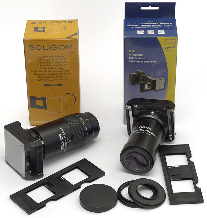 Altes Konzept. Objektivvorsatz mit Halter für Dias und Filmstreifen. Links: Soligor mit Optik zum Zoomen für Ausschnittsvergößerungen. Rechts: Dörr Dia Duplikator (wie Kaiser) mit abnehmbarer Nahlinse.