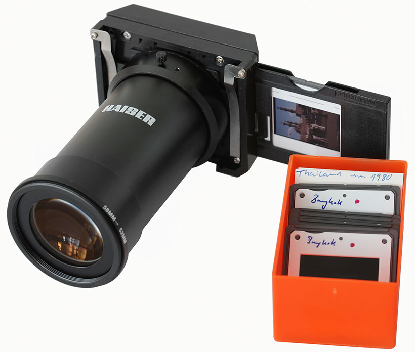 Kaiser Dia Duplikator, baugleich mit dem Dörr Dia-Duplikator. Die Nahlinse am Tubus ermöglicht die Verwendung von Nicht-Makroobjektiven.