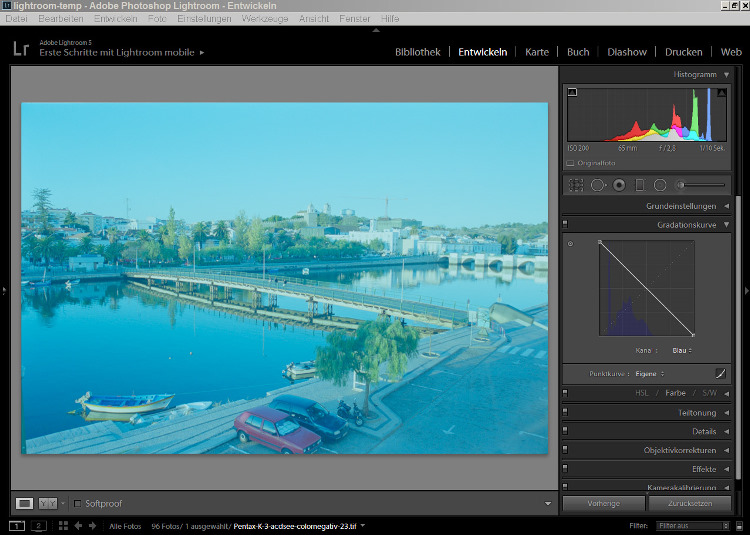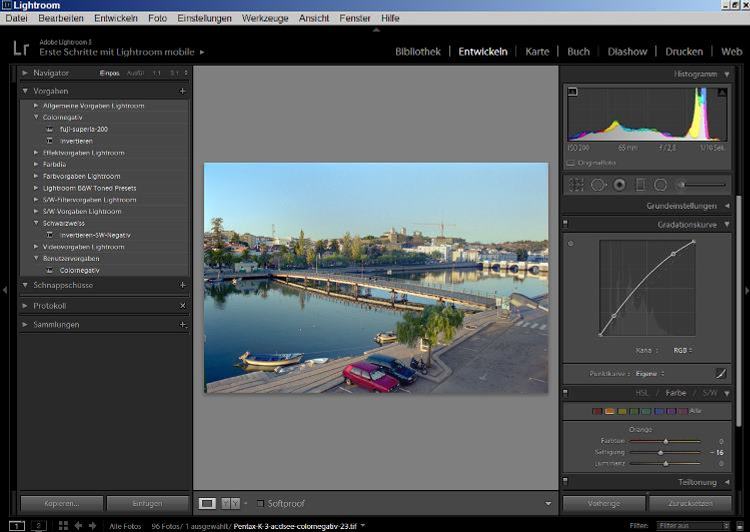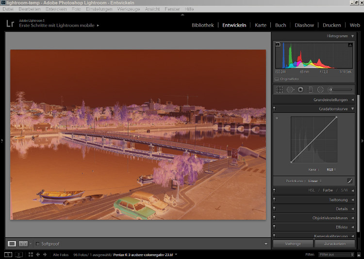 Beim abfotografierten Colornegativ sind die Tonwerte umgekehrt und das Bild ist orange maskiert. Adobes RAW-Konverter Lightroom hat keine automatische Funktion zum Invertieren von Farbnegativen. Für diese Bearbeitung wurde Lightroom 6 eingesetzt. Sie ist bei den nachfolgenden Versionen gleich geblieben.