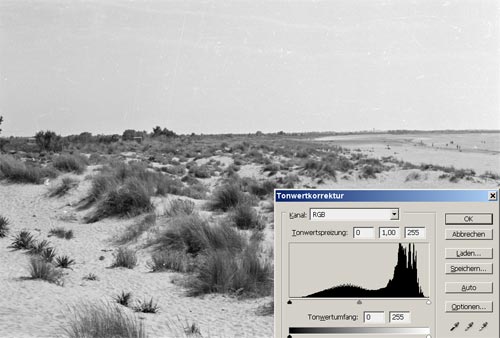 Indem diese durchaus voneinander differenzierbaren Towertstufen über den Darstellungsbereich hinausgehen, verliert man eine Zeichnung in den hellsten und dunkelsten Bildteilen. Eine sehr helle Wolke, die Strukturen zeigt, wird bei einer überstarken Spreizung des Histogramms zu einer strukturlosen weißen Fläche.