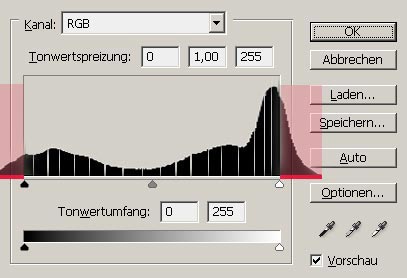 Hier wurden die Tonwerte auseinandergezogen und über den darstellbaren Bereich hinaus gespreizt. Dabei entstehen Lücken mit ungenutzten Tonwerten. Diese können im Bild sichtbare Tonwertsprünge verursachen. Die rot hinterlegten Tonwerte auf der linken Seite werden reines Schwarz. Die über den rechten Rand hinausgehenden Tonwerte werden reines Weiß.