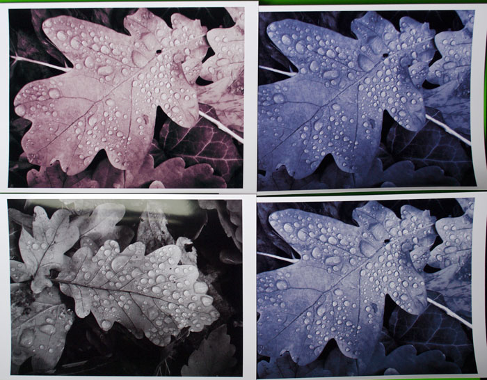 Das Tableau zeigt vier Ausdrucke aus zwei Tintenstrahldruckern von Canon (PIXMA ip4000 und PIXMA ip6000D). In allen Fällen wurde im Druckermenue die Einstellung 'Grayscale printing' (Schwarzweiss bzw. Graustufendruck) gewählt. Es wurden identische Papiersorten verwendet. Je nach Eingabe der Papiersorte ändert sich der Farbton.