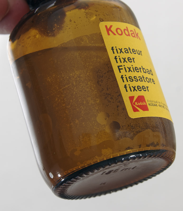 An der Innenseite des Fixiererkonzentrats hat sich ein Niederschlag an den Glaswänden gebildet.