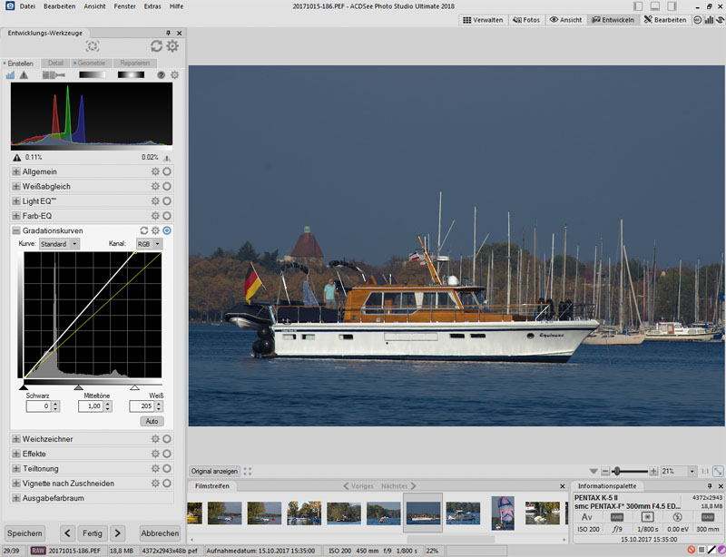 RAW-Konverter in der Standardansicht. Die schwebenden Fenster auf der rechten Seite lassen sich schließen, um das Foto größer zu sehen.