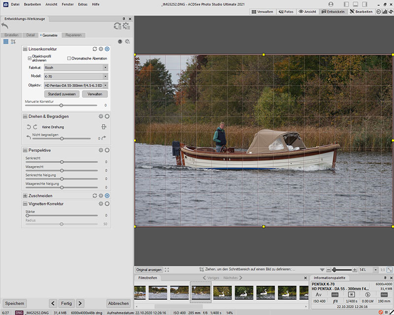 ACDSee kann viele Objektive und ihre Einstellungen erkennen. Die Daten werden in der Informationspalette des RAW-Konverters angezeigt. Es ist aber nicht immer imstande, automatisch das passende Objektiv in der Linsenkorrektur anzuzeigen und das LensFun Profil zu nutzen.