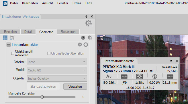 Der Screenshot zeigt hier im Register Geometrie im Feld Linsenkorrektur nicht die gleichen Daten wie in der Informationspalette. Weder die Kamera noch das Objektiv wurden von der Linsenkorrektur richtig erkannt, obwohl die Infos in der Informationspalette stimmen.