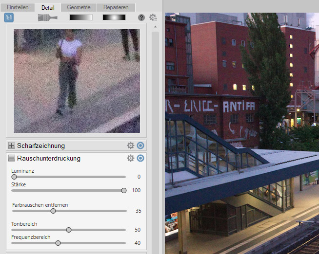 Das Tool zur Rauschunterdrückung entspricht nicht mehr dem Stand der heutigen Technik. Hier ist längst eine Automatik fällig, die gute Werte voreinstellt. DxO PhotoLab ist ACDSee nicht nur in dieser Hinsicht meilenweit voraus.