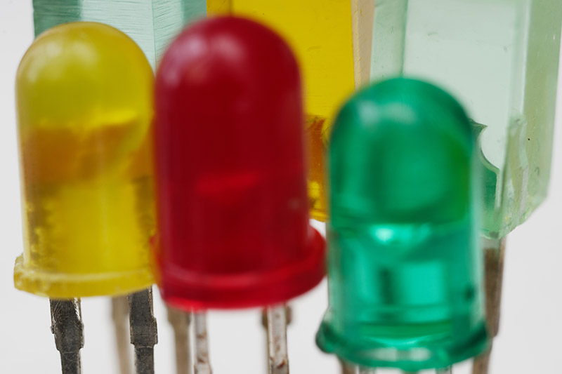 Leuchtdioden. Einzelnes Foto aus einer Belichtungsreihe mit fortlaufend leicht veränderter Scharfstellung, um vom Vordergrund bis in den Hintergrund alle Bereiche verteilt auf mehrere Bilder jeweils scharf aufzunehmen.