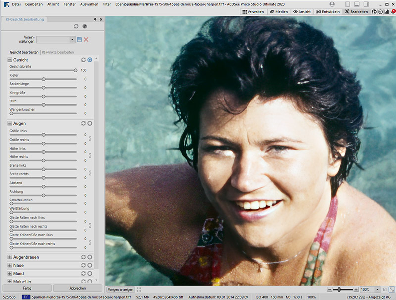 Die KI-Gesichtsbearbeitung enthält Schieberegler zur Veränderung von verschiedenen Partien im Gesicht. Man kann es breiter oder schmaler machen, die Nase verlängern oder kürzen, das Aussehen der Augen verändern, Falten glätten und mehr. An dem Original in diesem Beispiel gibt es eigentlich nicht zu verändern. Die Dame sieht auch so gut aus.