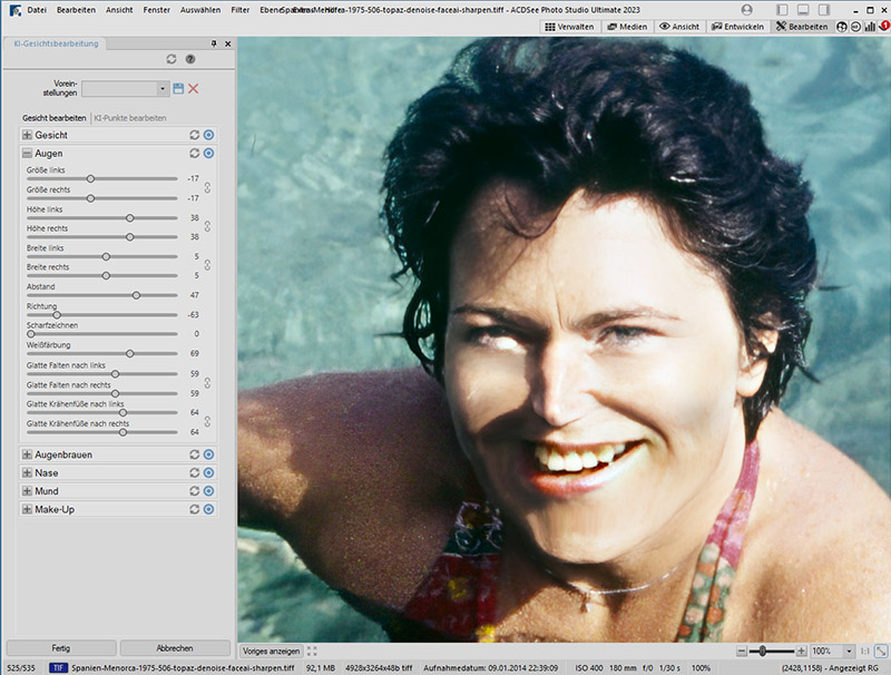 Die bearbeitete Version zeigt, dass Veränderungen möglich sind. In diesem Fall sind es keine Verbesserungen, sondern lediglich Änderungen, die die Wirkung verschiedener Einstellungen zeigen. Das Werkzeug ist ausbaufähig. Zum Beispiel wäre es gut, einen schiefen Mund zu begradigen oder insgesamt dunkle Augen mit guter Zeichnung aufzuhellen.