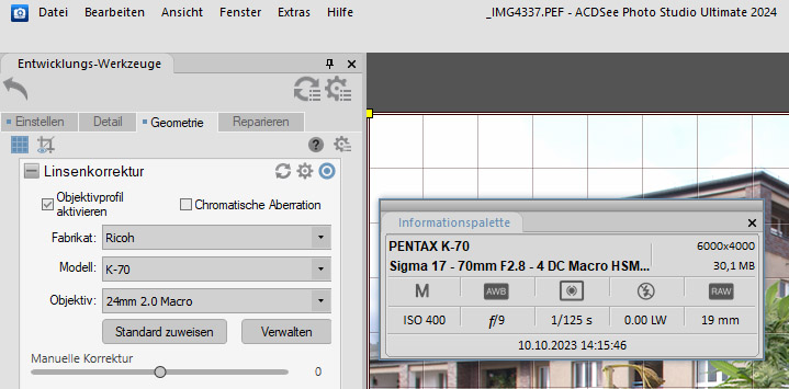 Die Informationspalette von ACDSee zeigt die Kamera und das Objektiv mit genauen Einstellungen zutreffend an, während gleichzeitig die Linsenkorrektur ein andere Objektiv vorschlägt. Manchmal stimmt sogar die Kamera nicht. Das ist nicht gut.