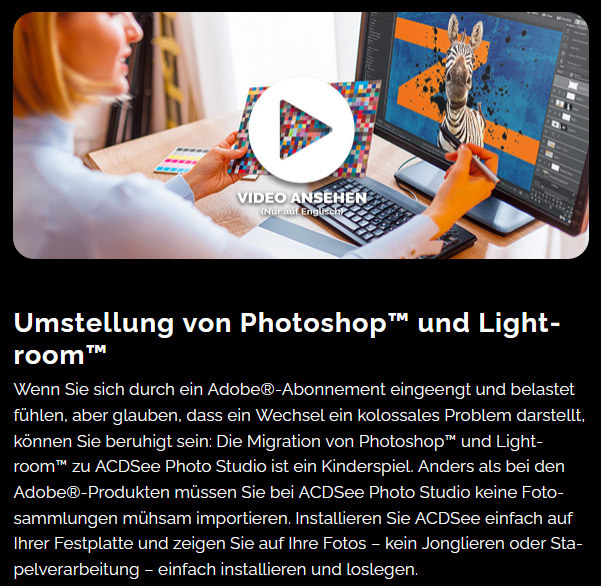 ACD Systems wirbt für den Umstieg von Lightroom und Photoshop zu ACDSee Photo Studio. Keine Frage, der Ehrgeiz ist vorhanden, um Adobe anzugreifen. Aber reicht die eigene Leistung dafür? Vergleichen wir Adobes Produkte mit ACDSee Photo Studio Ultimate anhand von vier Fragen.