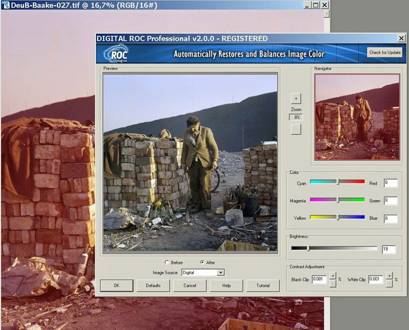 Für gute Ergebnisse ist der Einsatz des ROC Professional Plug-In anstelle der Version ohne 'Pro' im Namen sinnvoll, weil nur die Pro-Version die Möglichkeit bietet, Vorgaben für den 'Black-Clip' und 'White-Clip' einzugeben. Um möglichst keine Zeichnungsverluste in den Tiefen und Lichtern zu haben, setzt man beide Werte auf 0.001. Standardmäßig sind hier nach der Installation höhere Werte eingetragen, die nicht günstig sind, wenn die Bilder als Masterdateien mit maximaler Tonwertauflösung von den dunkelsten bis zu den hellsten Partien aufweisen sollen.