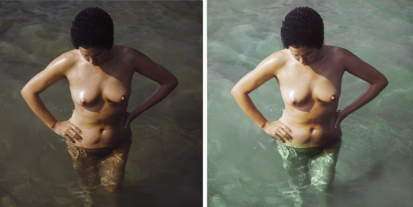 Links: Original. Rechts: Schatten etwas aufgehellt. Anschließend mit Lokale Anpassung Wasser maskiert/markiert und Farbe selektiv umgefärbt.