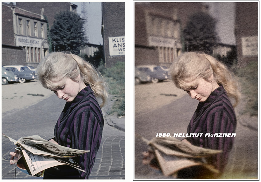 Links: Original. Rechts: Wasserzeichen in Blade Runner Schrift, Tonung, Korn, Papiertextur, unscharfe Vignette