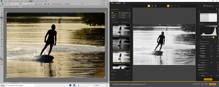 Im Filter-Menue von Adobe Photoshop wird die Nik-Collection angezeigt und man kann daraus ein Werkzeug wählen. Hier: Silver Efex 3 zur Scharzweißtonung.