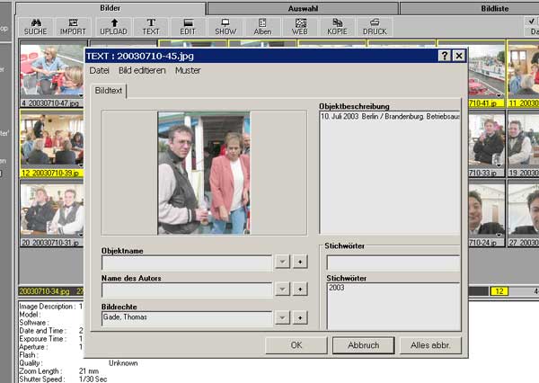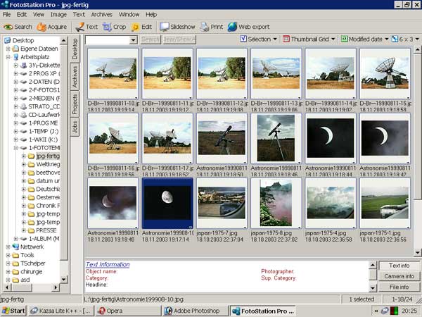 Das Textfeld unterhalb der Thumbnails enthält in älteren Versionen (Fotostation 4) nur die Objektbeschreibung. Fotostation 4.5 zeigt zuerst Exif-Daten, die von der Digitalkamera stammen. Der für die Archiverung maßgebliche Text erscheint darunter. Wer seine Einträge lesen möchte, muss das Textfeld zu Lasten der Thumbnailübersicht vergrößern. Man sollte die Exif-Darstellung ausblenden können.