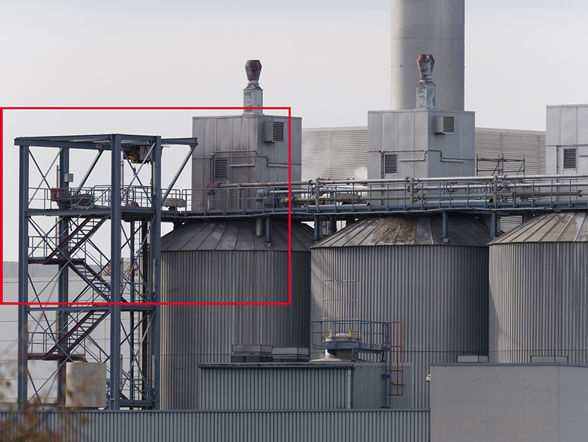 Panasonic Lumix DC-G9 Micro-Four-Thirds-Sensor mit 20,3 Megapixel Markteinführung 2017 ISO-Einstellbereich: 200 - 25.600 ![]() 2019. Kraftwerk Moabit in Berlin. Der rot umrandete Ausschnitt wird für mehrere ISO-Einstellungen gezeigt. RAW-Dateien, entwickelt mit DXO Photolab 2.3 |