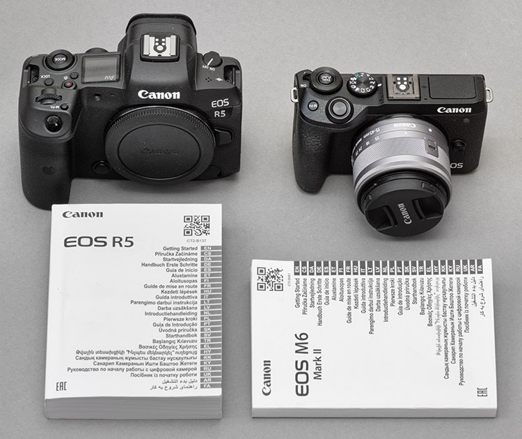 In der Verpackung der Canon EOS R5 befindet sich eine 2,3 cm dickes Büchlein mit den Ausmaßen 10,5 × 14,9 cm. Das ist ungefähr so groß wie eine Postkarte. Es enthält rechtliche Disclaimer, Entsorgungshinweise und minimalistische Bedienungshinweise in 26 (!) Sprachen.Dazu zählen 20 deutschsprachige Seiten. Fünf davon beschreiben, wie eine drahtlose Verbindung zum Smartphone hergestellt wird. Drei weitere benennen 65 Teile, Schalter und Steckplätze anhand dreier Grafiken. Eine Seite gibt an, wie der Akku geladen wird und nur fünf Seiten widmen sich der Bedienung dieser komplexen, mit vielen Optionen versehenen Kamera, die aktuell (Mai 2021) 4500 € kostet. Die anderen Seiten enthalten Infos, die mit der Bedienung der Kamera nichts zu tun haben.
