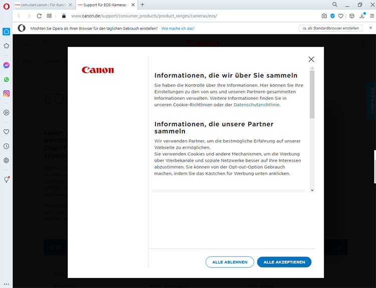 Alternativ versuche ich es mit dem Browser Opera, der an der oberen Kante eine Cookie-Mitteilung einblendet, bei der man ‚Zustimmen‘ oder ‚Nicht zustimmen‘ anklicken darf. Es ist egal, auf welche man klickt. Danach erfolgt die Aufforderung: „Wählen Sie ein Vertriebsunternehmen in Ihrem Land oder Ihrer Region“