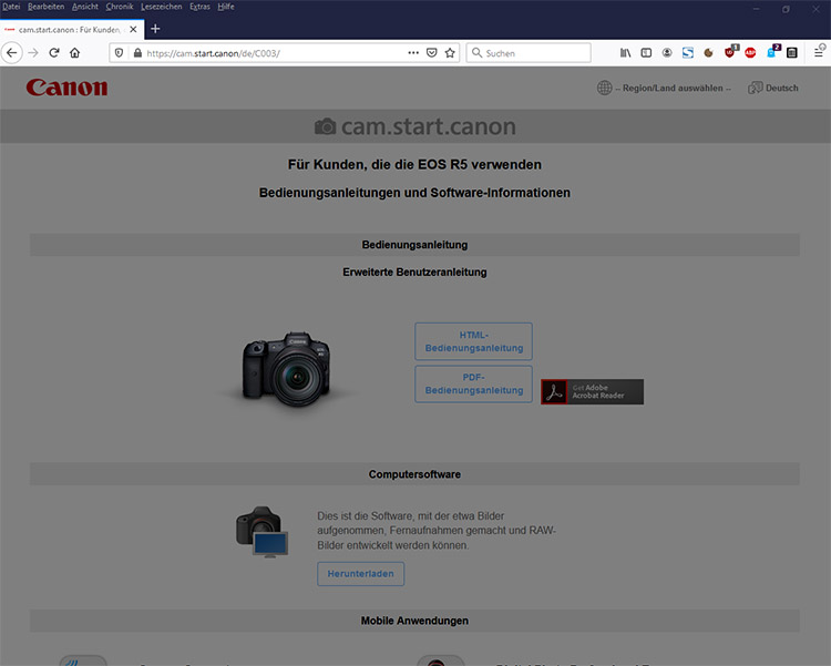 "Laden Sie Treiber, Software, Firmware und Handbücher herunter, und nutzen Sie den Zugriff auf Online-Ressourcen für technischen Support und Fehlerbehebung."Das ist verwirrend und abermals Zeit vergeudend, weil man sich bereits von der Downloadseite für die Canon EOS R5 hierher bewegt hat. Mithilfe von Listen und Registern navigiert man sich nun aber endlich zur richtigen Downloadseite für die Canon EOS R5 oder für eine andere Kamera. Den umständlichen Weg kann man sich ersparen, in dem man gleich diese Adresse für die Canon EOS R5 eingibt: